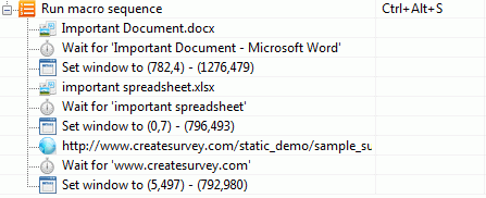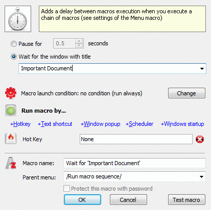Hot Keyboard executes macros very fast and if we want to be sure the document has been loaded, we must add a "Delay" macro which will make a pause until a document window appears and then switch to the next macro
