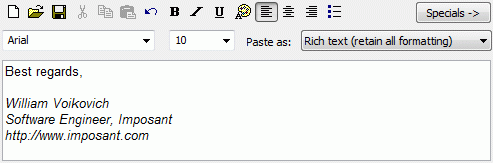 To include special values (such as date, time, files, special keys) there are several methods to use. These values can be inserted using Specials menu: